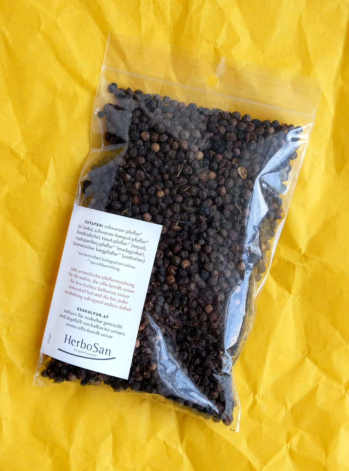 meine mama ist 2022 in pension gegangen, ihre firmen in österreich und deutschland wurden aufgelöst. bis ende märz 2023 hat der von ihr gemischte vorrat an 5-länder-pfeffer gereicht, dann musste ich eine neue lösung suchen. nun bin ich selbst kundin bei ihrem jahrzehntelangen großhändler, dessen sagenhaft gute produktqualität für mich voraussetzung war, den 5-länder-pfeffer weiterzuführen. im zuge der umstellung musste ich den von anfang an knapp kalkulierten preis erstmals erhöhen. damit er knapp kalkuliert werden kann, ist der pfeffer übrigens in den flachen und gänzlich unspektakulären sackerln verpackt. das spart porto und teure verpackungsmaterialen wie dosen oder gläser. jede/r kann ihn ja gern zuhause in ein vorratsglas oder einen anderen behälter umfüllen. und somit ist die frohbotschaft: der 5-länder-pfeffer ist ab sofort wieder in genau gleicher qualität wie bisher lieferbar!