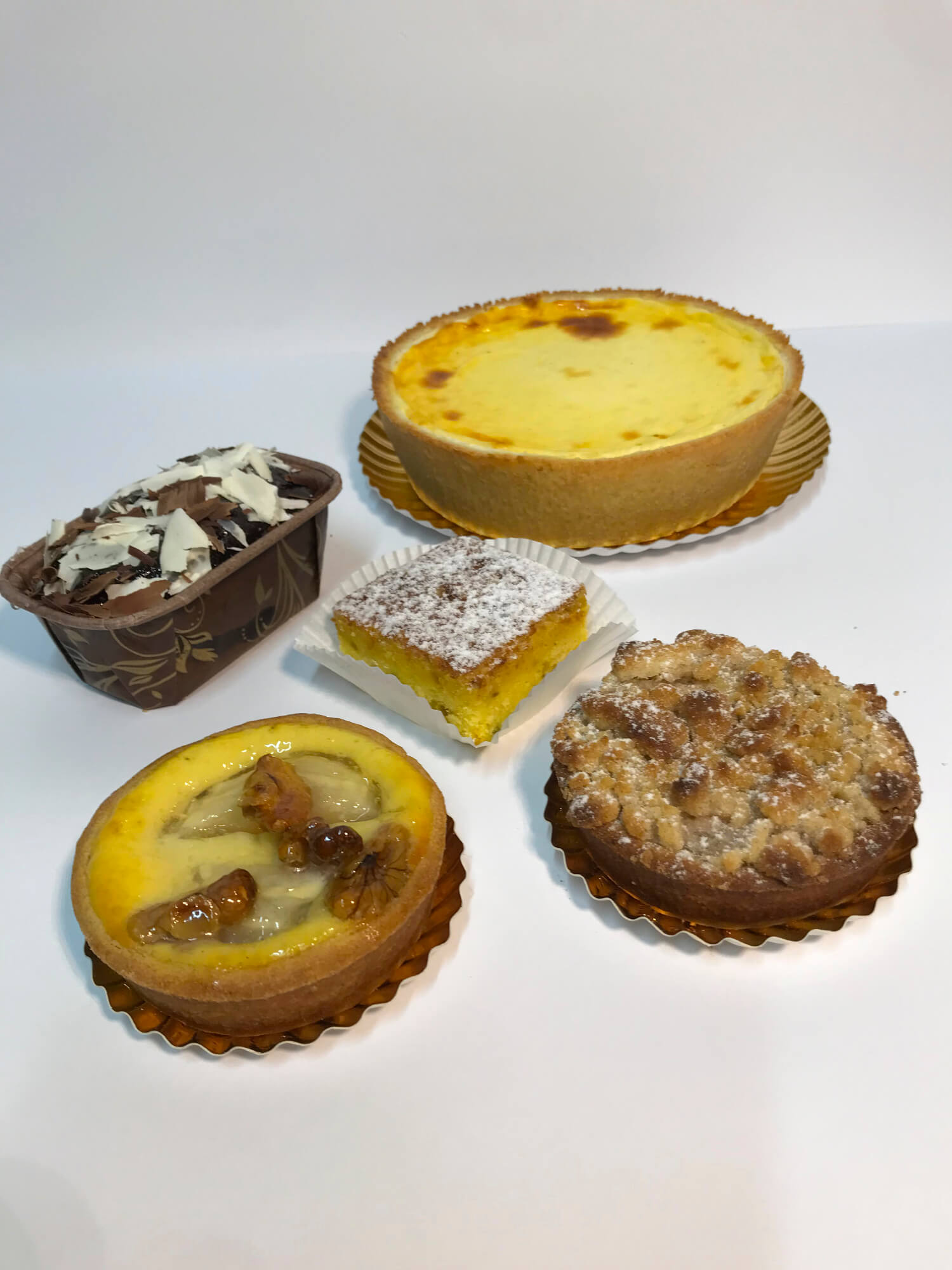 mit 1. unserem Feinschmecker-Käsekuchen (groß, 16 cm), 2. kleinem Apfel-Streusel, 3. kleinem Obstkuchen mit Fruchtsorte nach Wahl (Kirsch, Aprikose, Zwetschge, Mandarine, Himbeere, Birne/Walnuss, Beerenmischung) und 4. jeweils einer Marokkanischen Orangenschnitte und 5. einem kleinen Schokokuchen.