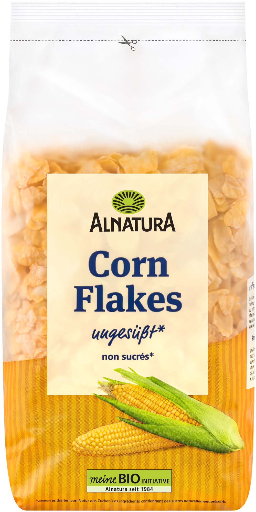 Knusprig-feine Frühstücksklassiker: Die Alnatura Cornflakes ungesüßt (Zutaten enthalten von Natur aus Zucker) werden im traditionellen Walzverfahren hergestellt. Sie schmecken in Milch, Joghurt sowie deren pflanzenbasierten Alternative oder einfach pur geknabbert. Ihre Zutaten stammen aus Bio-Landbau und sind vegan.