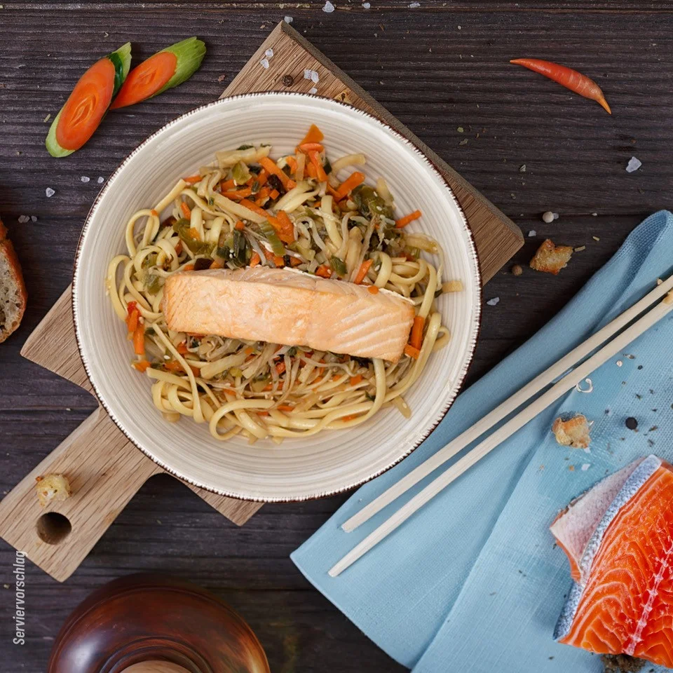 Ob als schnelle Mahlzeit für die Mittagspause oder als delikates Abendessen nach einem langen Tag – unsere Asia Nudeln mit Wok Gemüse und Lachs sind die ideale Wahl für alle, die Wert auf gesunde Ernährung und exquisiten Geschmack legen.