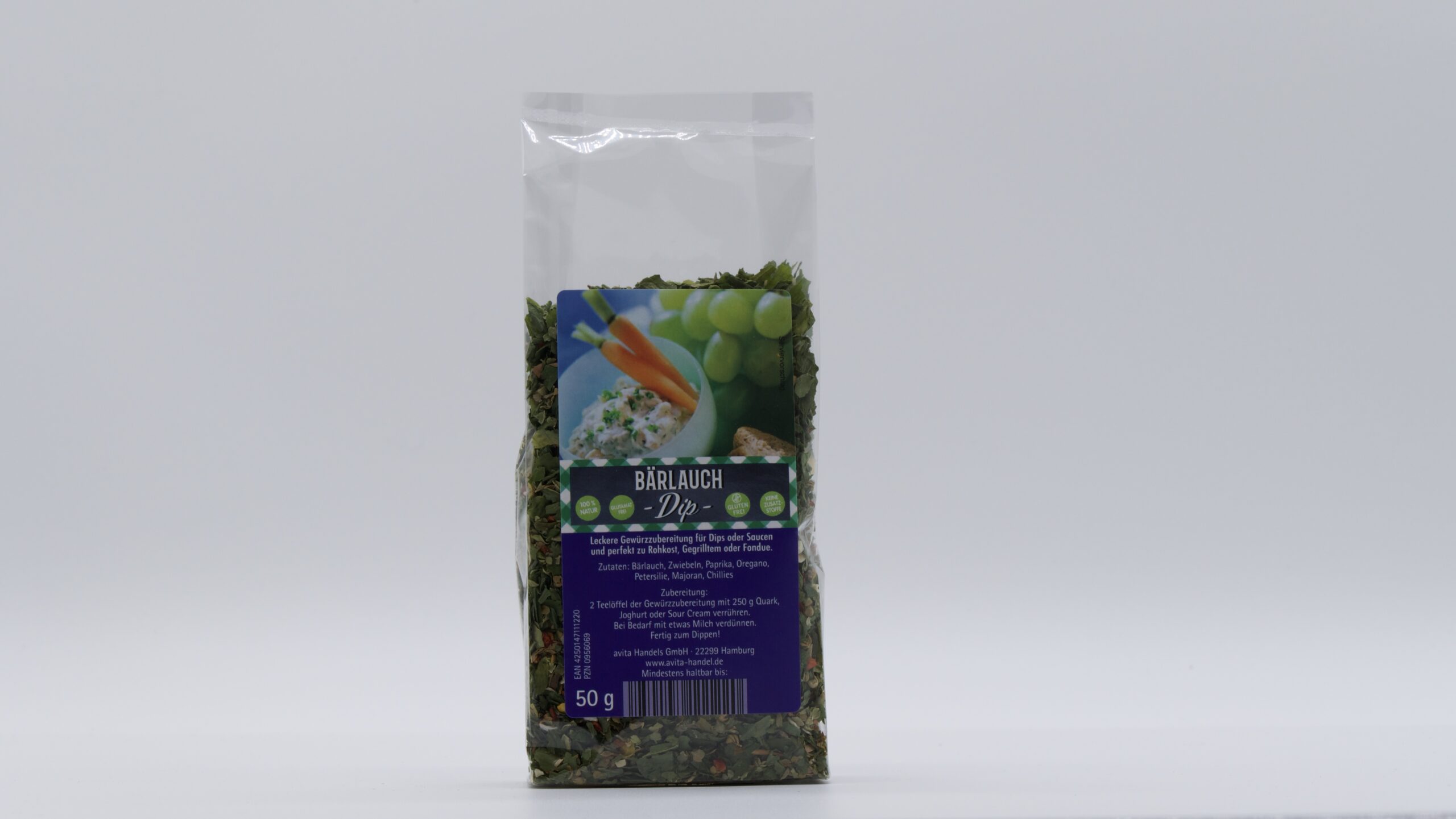 Die Zubereitung ist ganz einfach: 2 Teelöffel der Gewürzzubereitung mit 250 g Quark, Joghurt, Sour Cream oder Creme Fraiche verrühren. Ca. 30 Minuten warten und fertig zum Dippen!