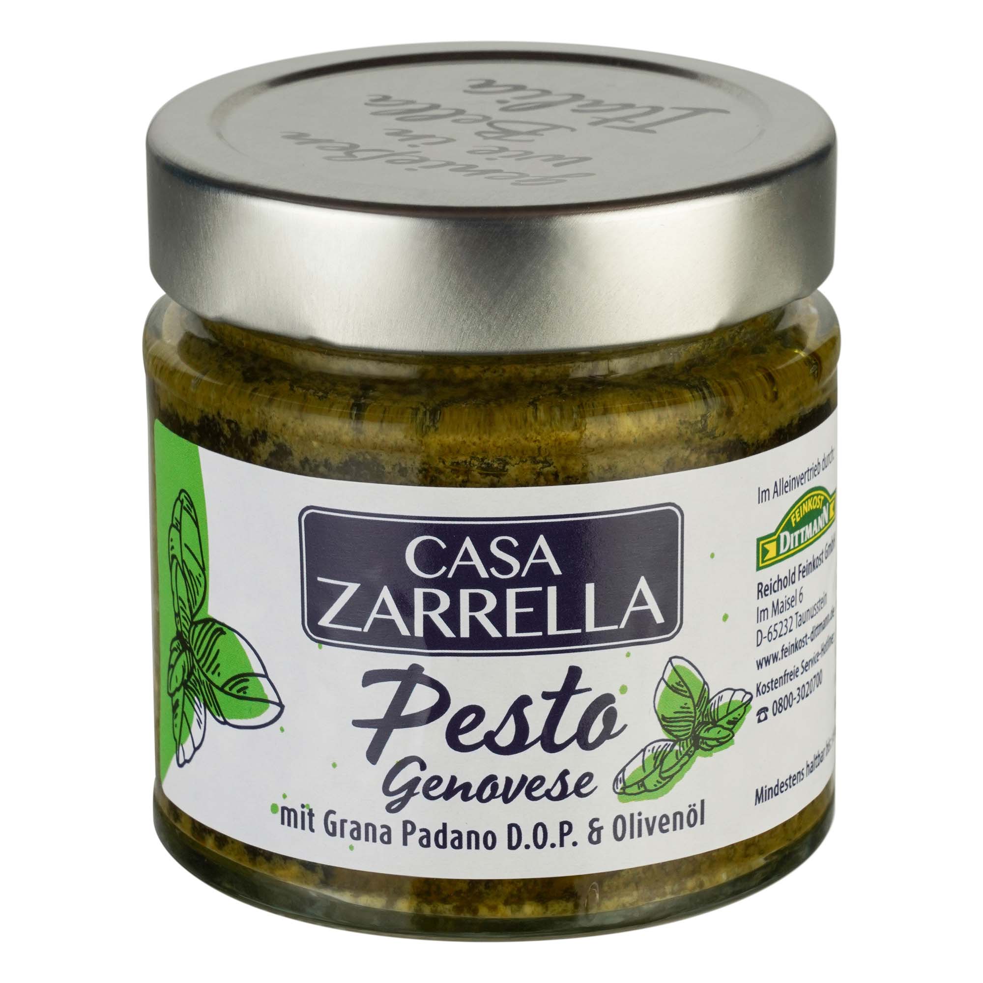 Diese typische italienische Würzpaste der Premium-Marke Casa Zarrella besteht aus Basilikum, gerösteten Pinien- und Cashewkernen und wird mit echtem Grana Padano Käse, Knoblauch und extra nativem Olivenöl abgeschmeckt.
