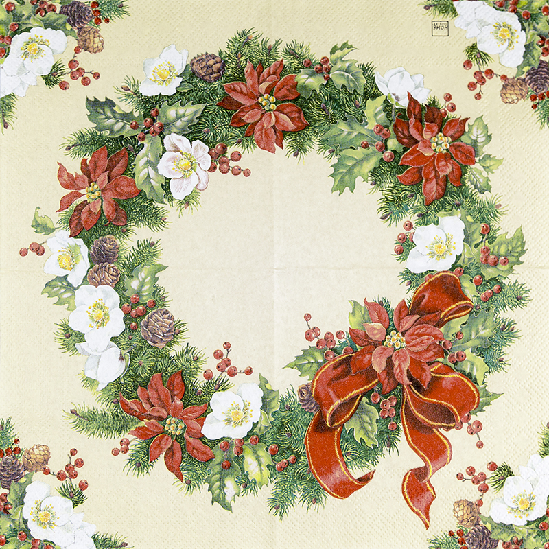 Elegante dreilagige Servietten ‚Christmas Wreath‘ mit weihnachtlichem Kranzmotiv in Cremefarben. Perfekt für festliche Dekoration.
