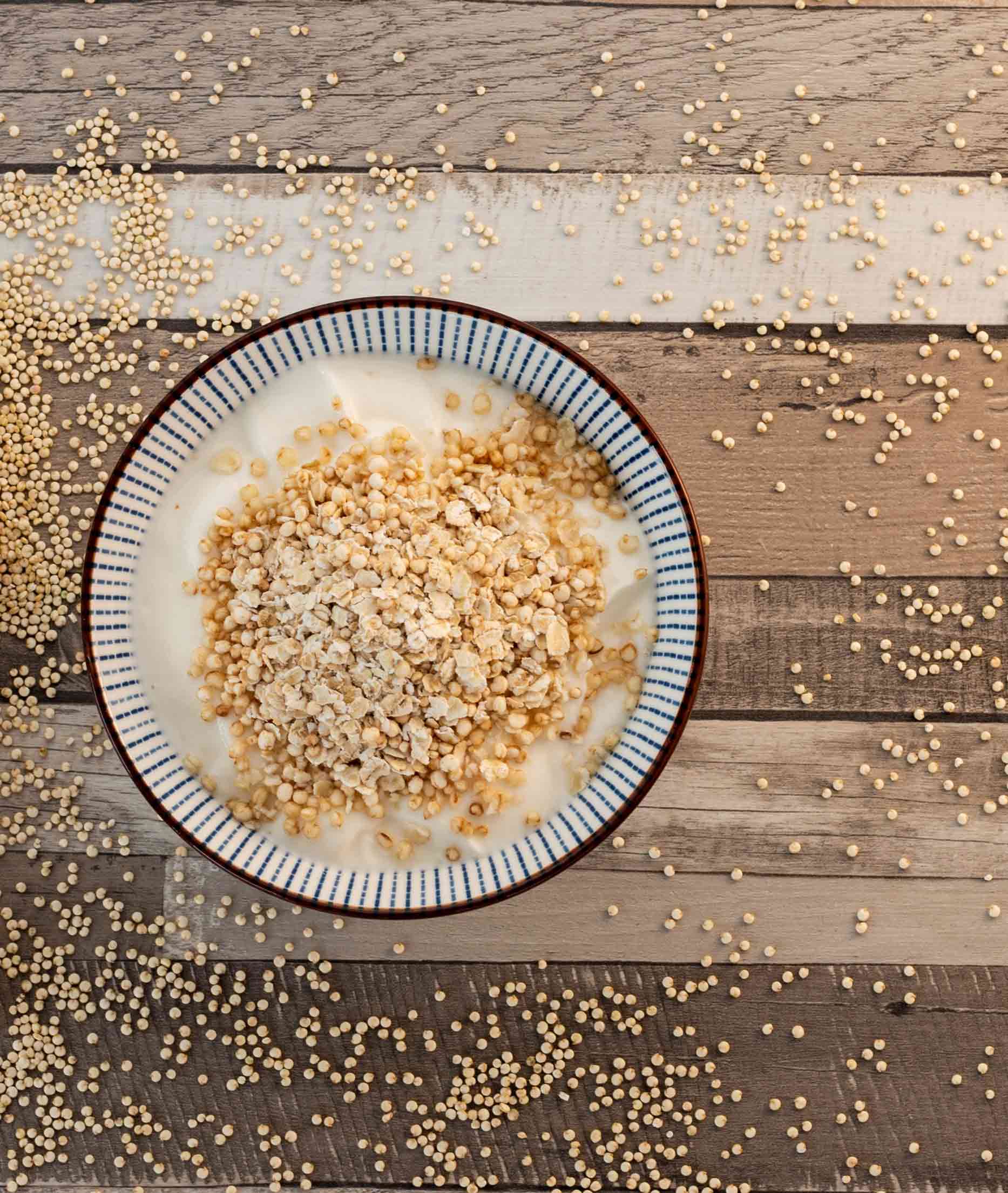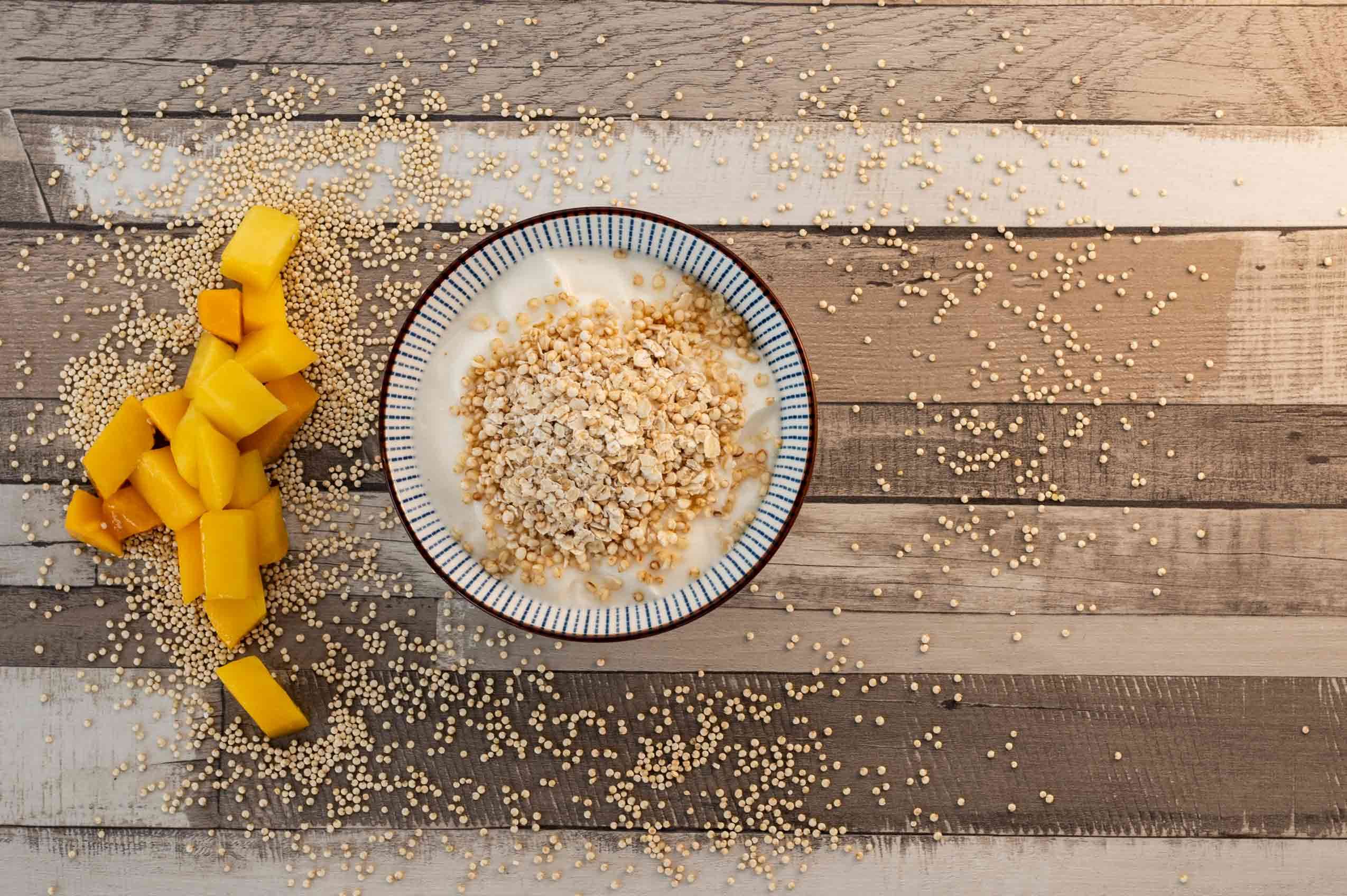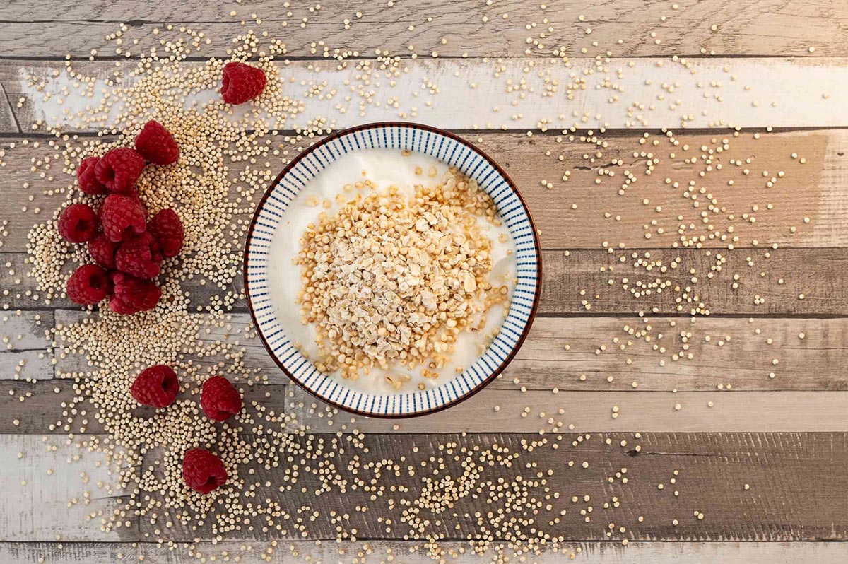 Der Tag startet mit einem leckeren Müsli bestehend aus Haferflocken und Quinoa, gemischt mit Joghurt und Magerquark. Als Topping kommen noch Früchte wie Himbeeren oder Mango obendrauf. Du wirst überrascht sein, wie sättigend diese leichte Speise ist. Zudem wirst du dich mit solch einem bekömmlichen Frühstück gleich gut fühlen – weniger vollgefressen, dafür mehr energiegeladen.