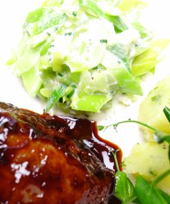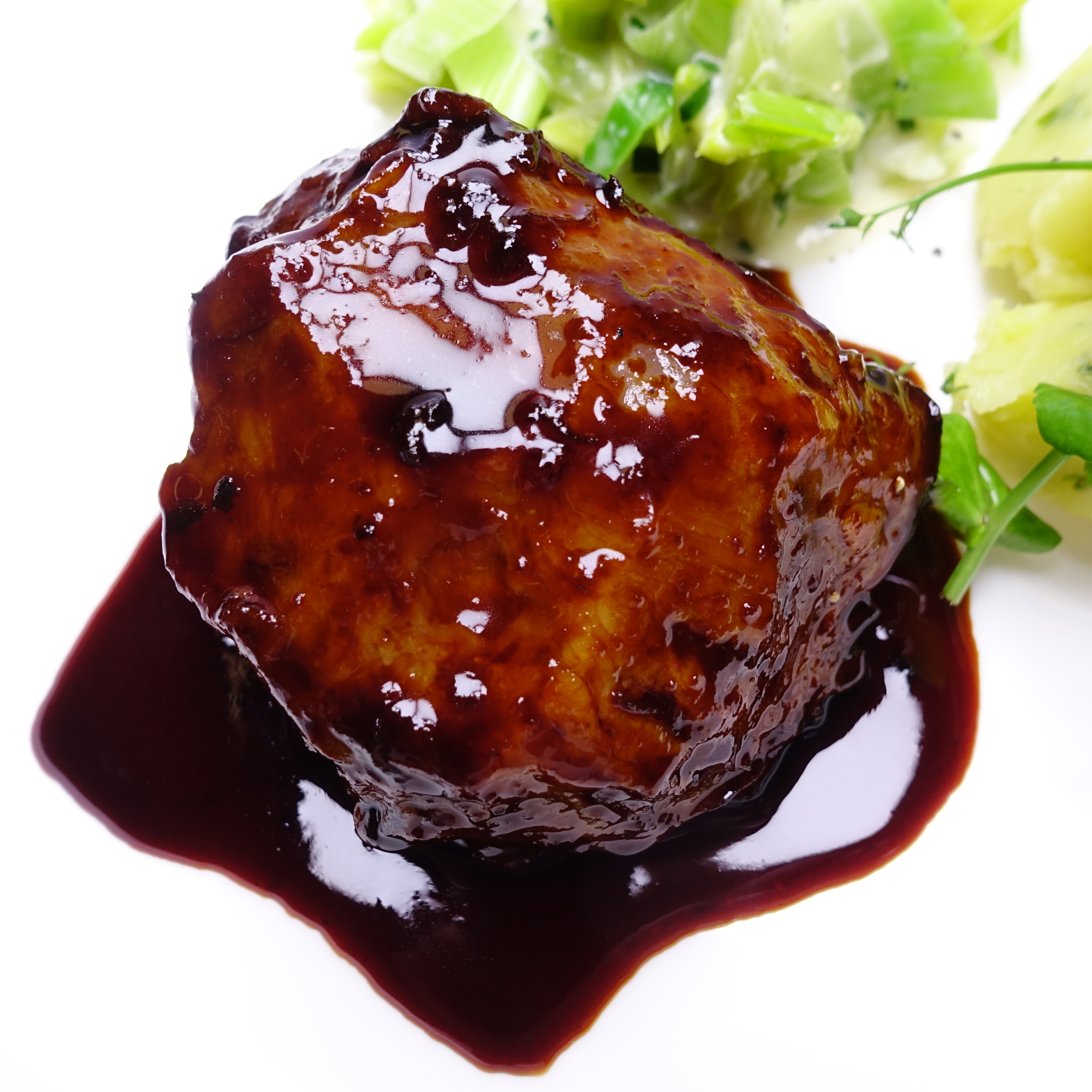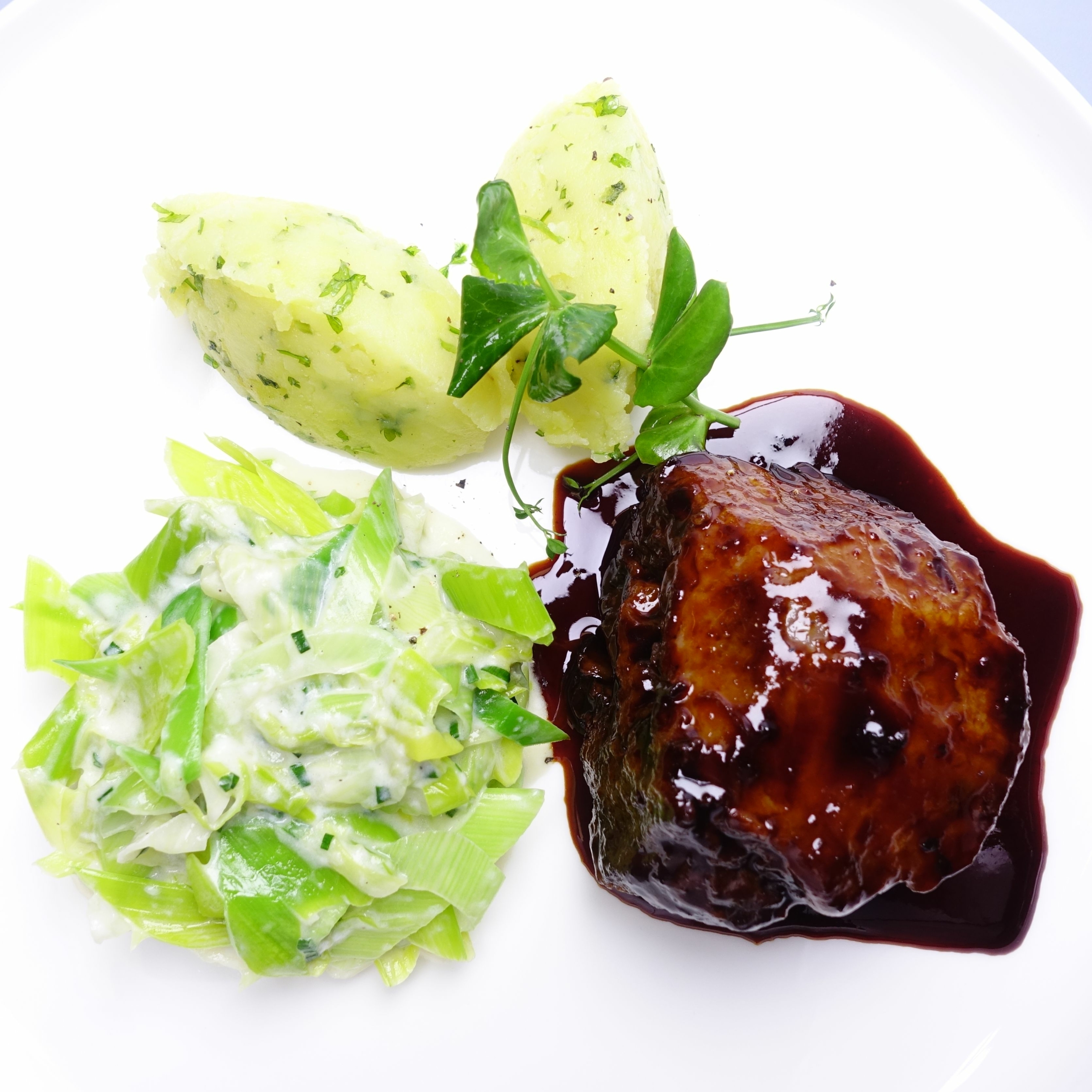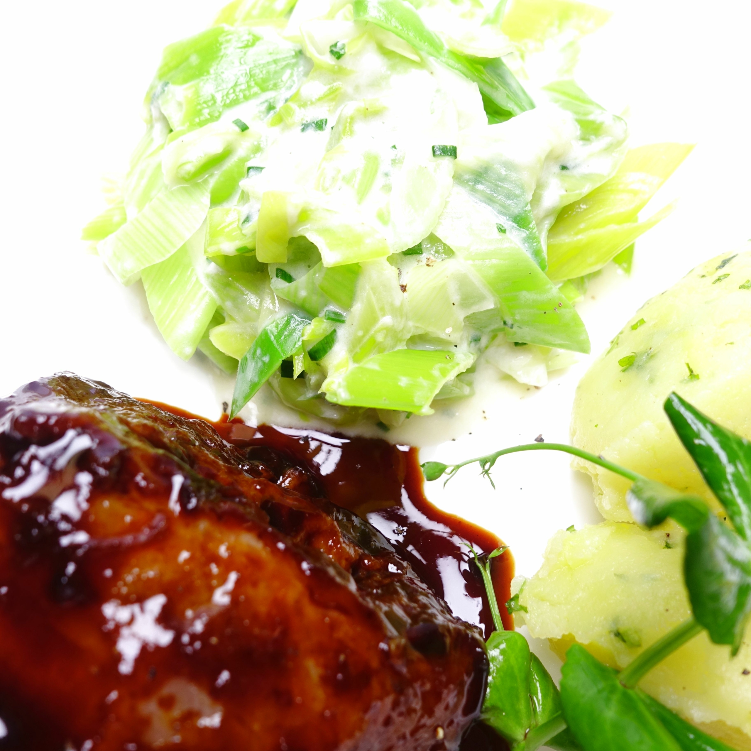 Unsere geschmorte Kalbsbacke servieren wir mit saisonalem Gemüse, Kartoffelstampf und Jus.