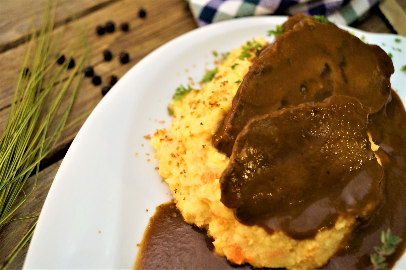 Die Süße der Karotte passt perfekt zur zarten Struktur der Kartoffel. Daraus zaubern wir bewusst ein „Stampf“ mit kleinen Stückchen von Kartoffel und Karotte und eben kein Püree.