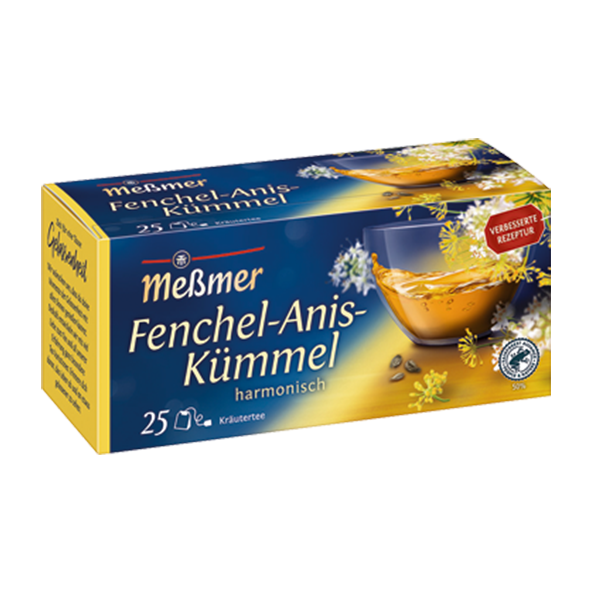 Kaum eine andere Kräuterkomposition erfreut sich so einer großen Beliebtheit, wie die Mischung aus würzigem Fenchel, süß-aromatischen Anis und kräftigem Kümmel. Bereits bei dem Gedanken an eine heiße Tasse Tee dieser vollmundigen Kräuter breitet sich ein wohliges Bauchgefühl aus. Unsere Tee-Experten wissen um diese positiven Eigenschaften und haben im Meßmer Fenchel-Anis-Kümmel-Tee die 3 Kräuter harmonisch miteinander vereint für ein ausgewogenes Genusserlebnis.