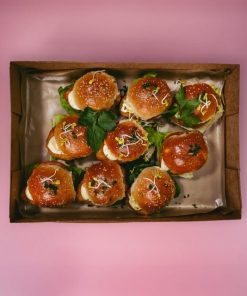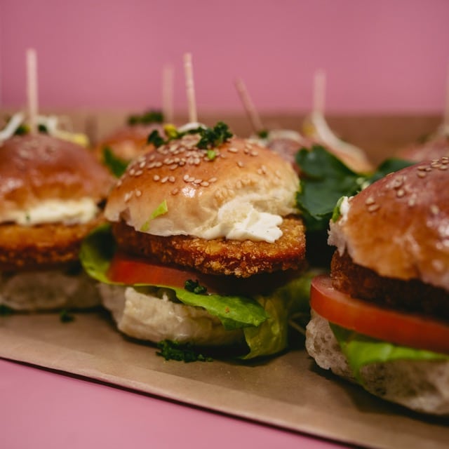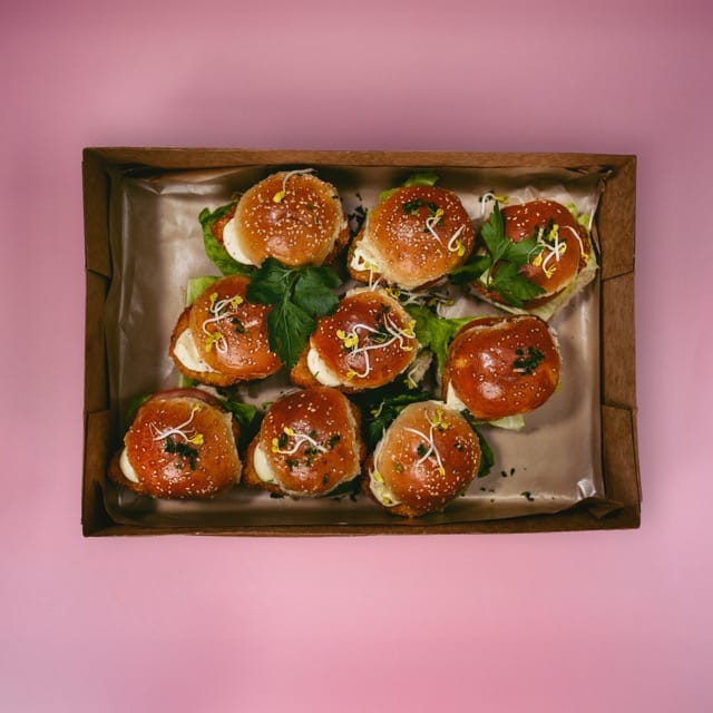 Eine Box mit leckeren Mini-Chickenburgern.