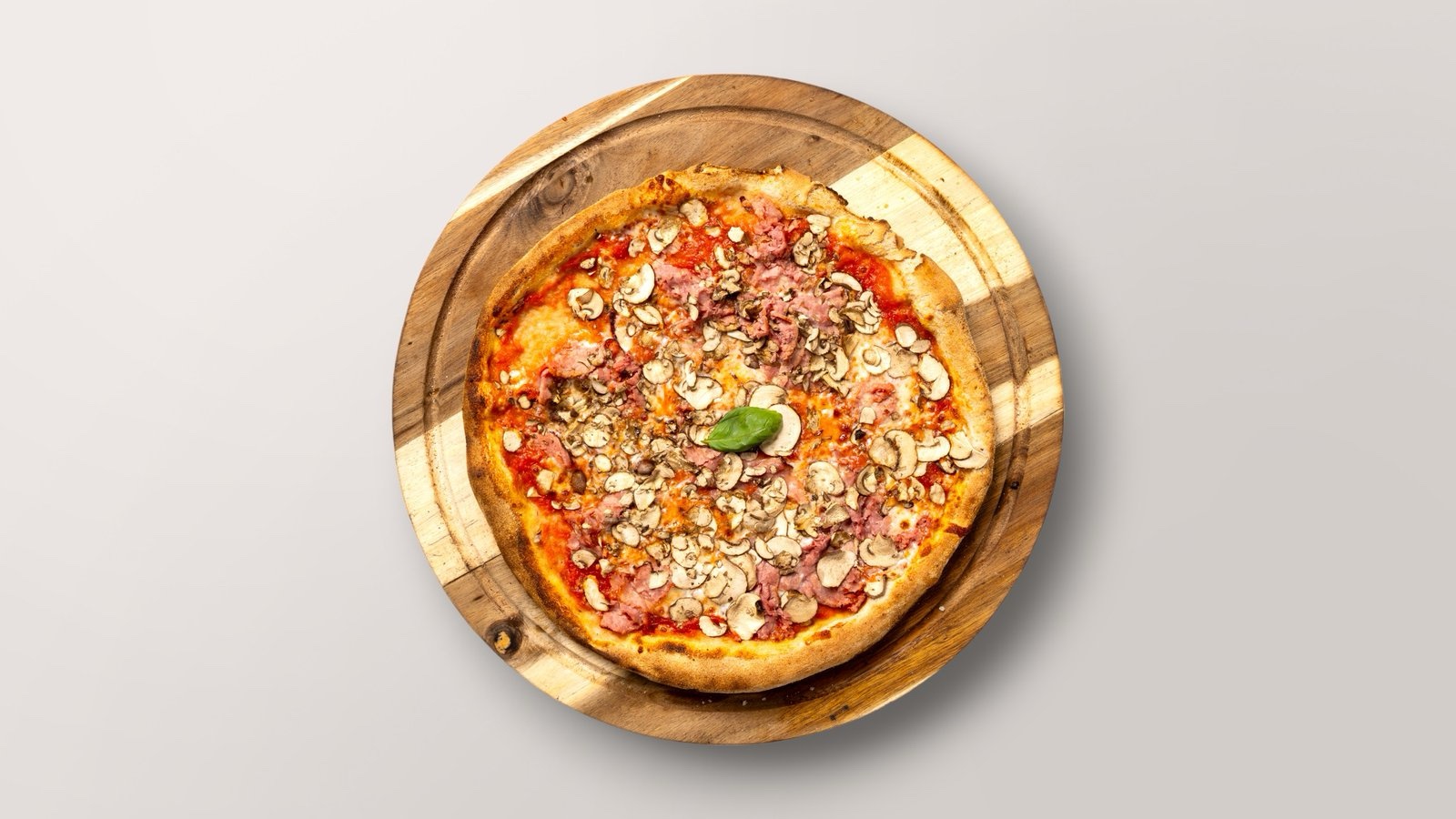 Bio-Dinkelteig, Bio-Tomatensosse, Mozzarella, Rinderschinken, Champignons, Basilikum, Oregano