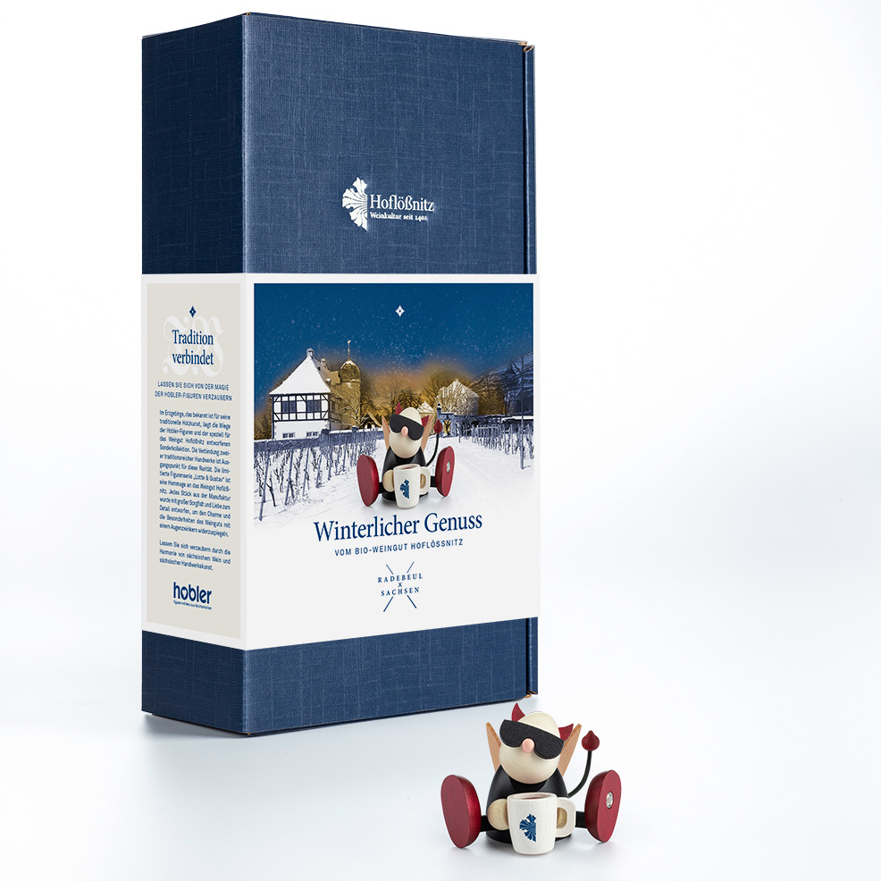 Im Erzgebirge, das bekannt ist für seine traditionelle Holzkunst, liegt die Wiege der Hobler-Figuren und der speziell für das Weingut Hoflößnitz entworfenen Sonderkollektion. Die Verbindung zweier traditionsreicher Handwerke ist Ausgangspunkt für diese Rarität. Die limitierte Figurenserie „Lotte & Gustav“ ist eine Hommage an das Weingut Hoflößnitz. Jedes Stück aus der Manufaktur wurde mit großer Sorgfalt und Liebe zum Detail entworfen, um den Charme und die Besonderheiten des Weinguts mit einem Augenzwinkern widerzuspiegeln.
