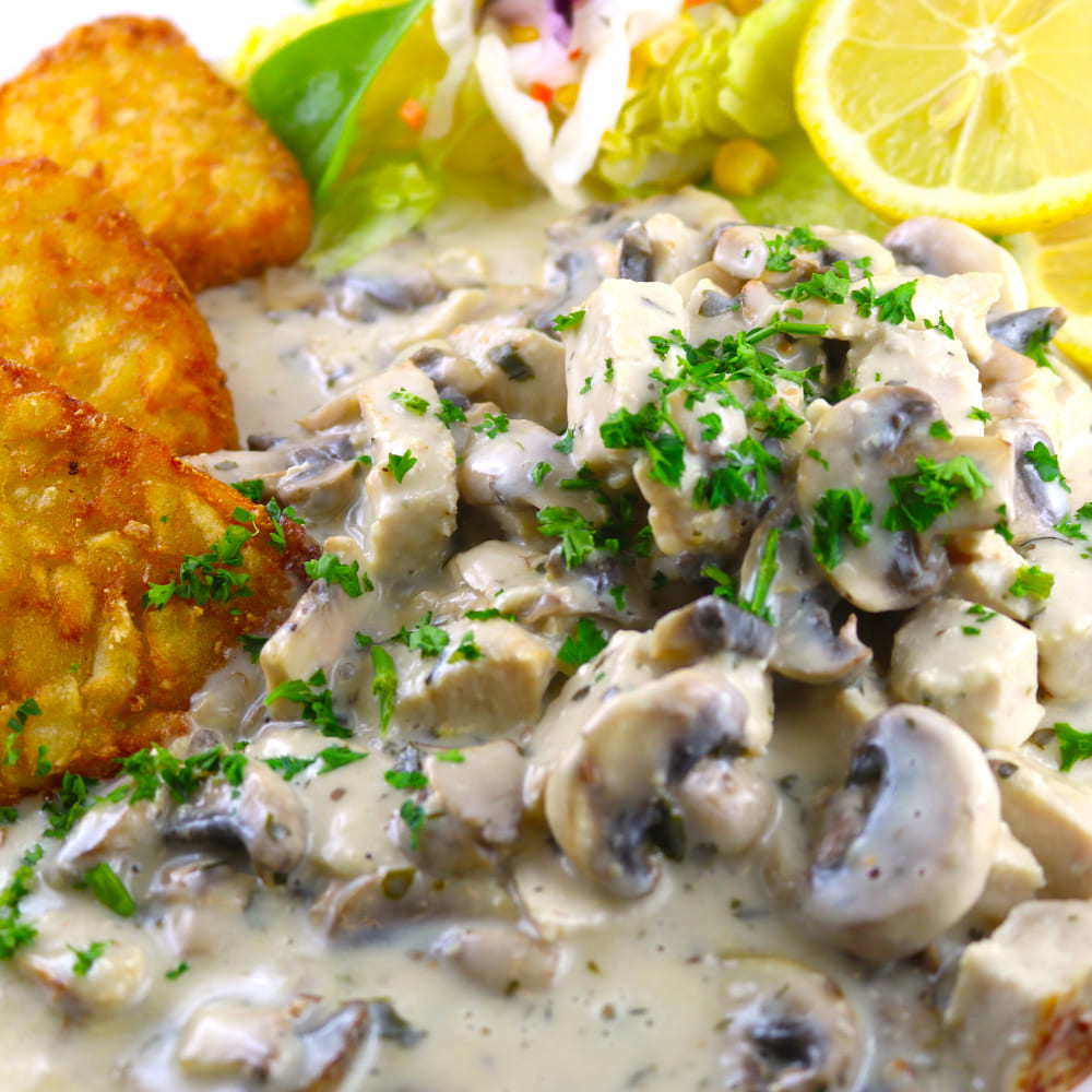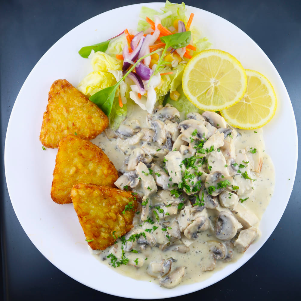 In Champignon-Weißweinsauce, mit Röstis & Salatbeilage.
