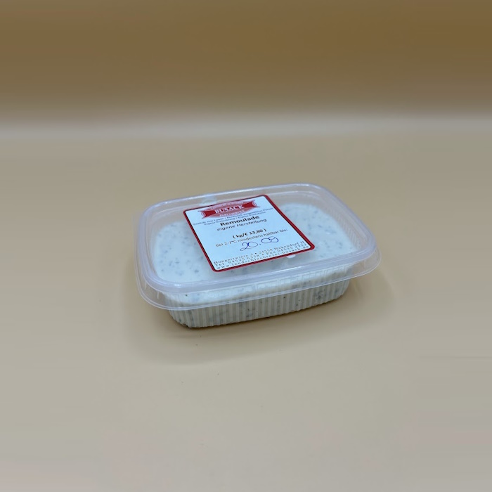Entdecke den frisch-cremigen Geschmack unserer hausgemachten Remoulade! Fein abgestimmte Kräuter, Gewürze und eine zarte Mayonnaise-Basis machen sie zum perfekten Begleiter für Fisch, Fleisch oder als Dip. Ein echter Klassiker – selbstgemacht mit Liebe!