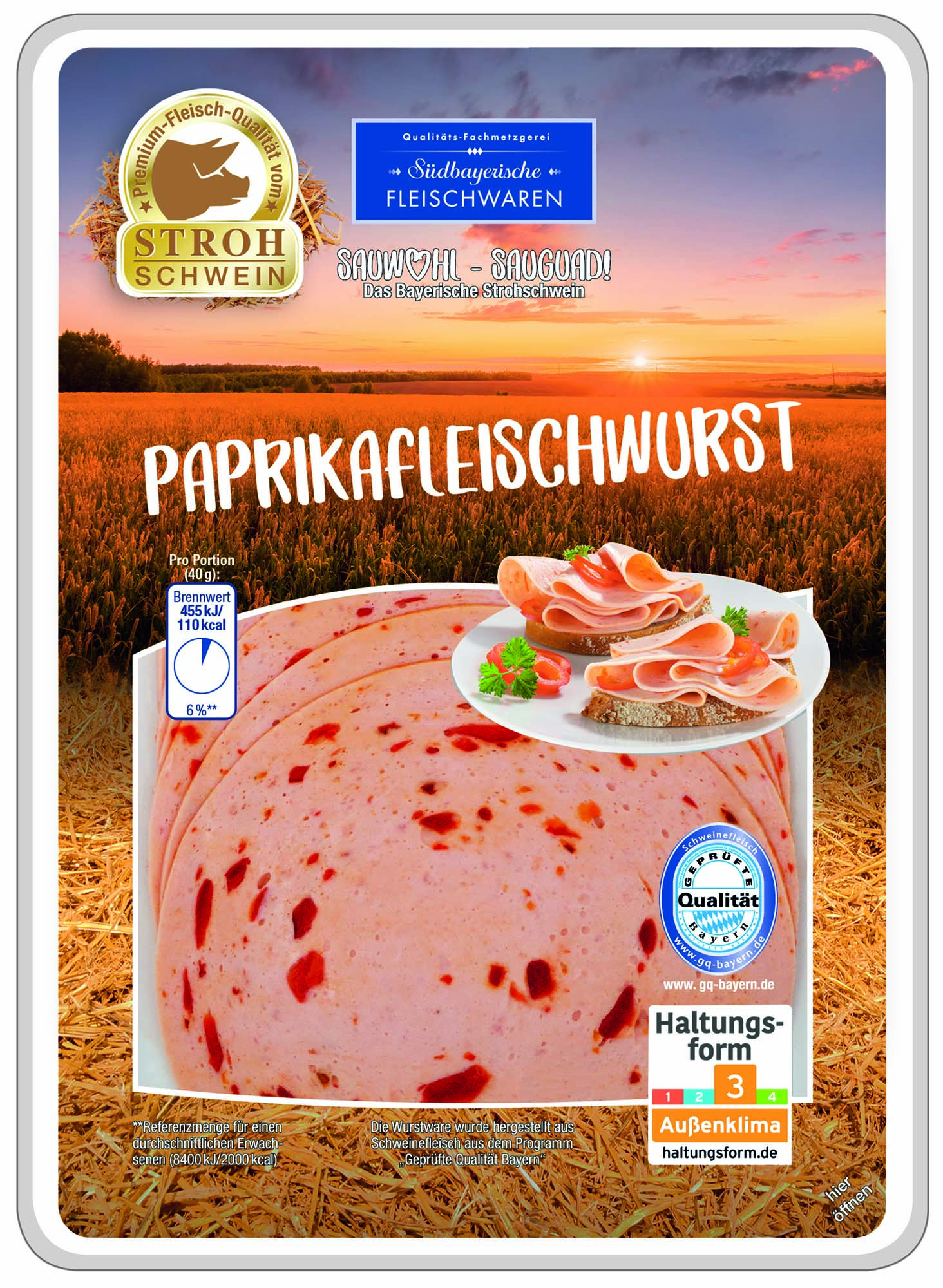 Hergestellt aus Schweinefleisch aus dem Programm „Geprüfte Qualität Bayern“. Die Fleischwurst enthält fein geschnittene Paprikastücke und ist ideal für den kalten Verzehr, beispielsweise als Brotbelag oder als Zutat für Salate.
