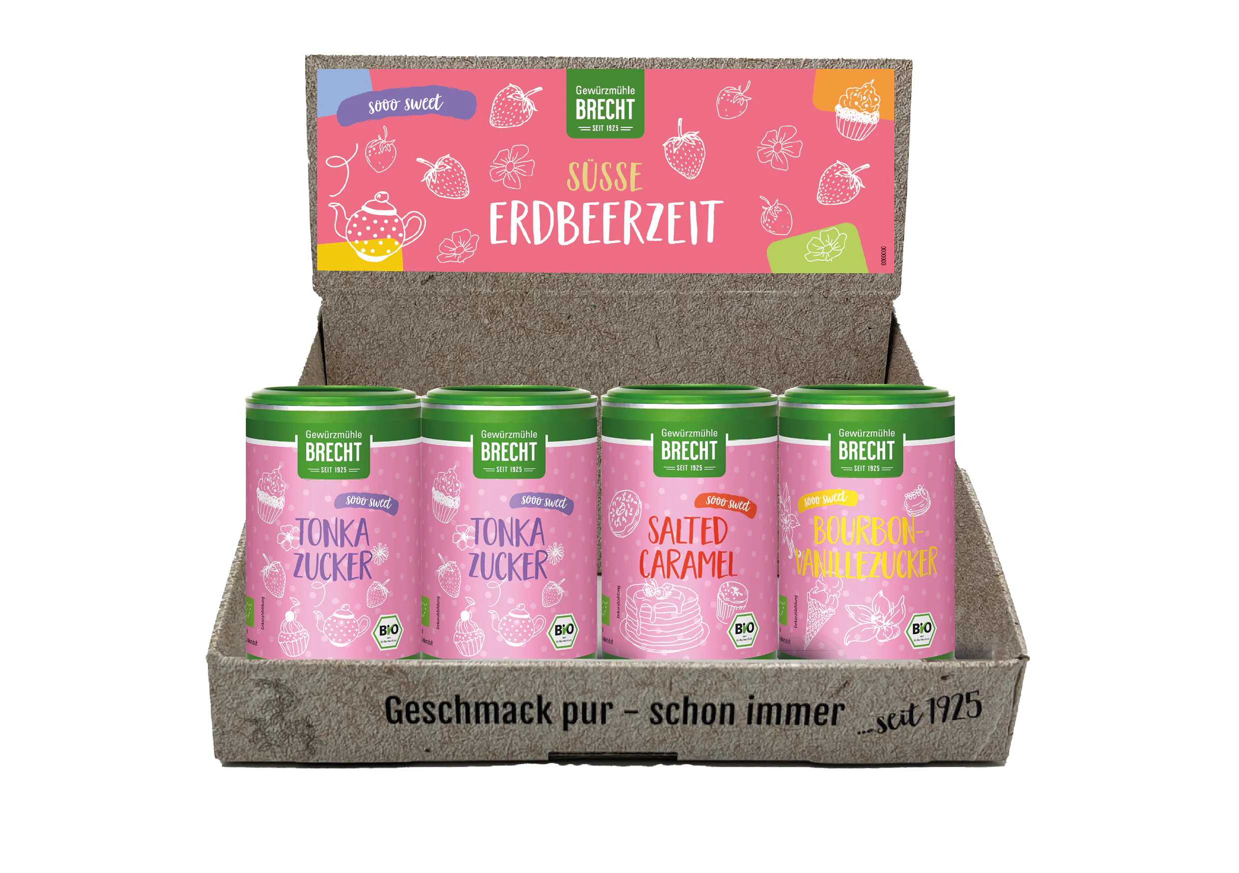 Thekendisplay „Süße Erdbeerzeit“ mit 6 Dosen Tonka Zucker und je 3 Dosen Salted Caramel und Bourbon-Vanillezucker.