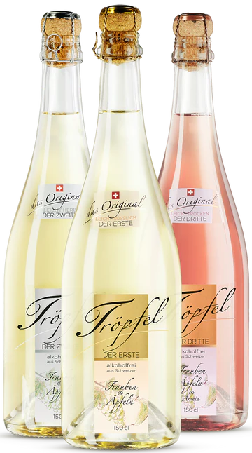 Prickelnd-perlender Schaumwein aus Ostschweizer Trauben und Äpfeln ohne Alkohol.