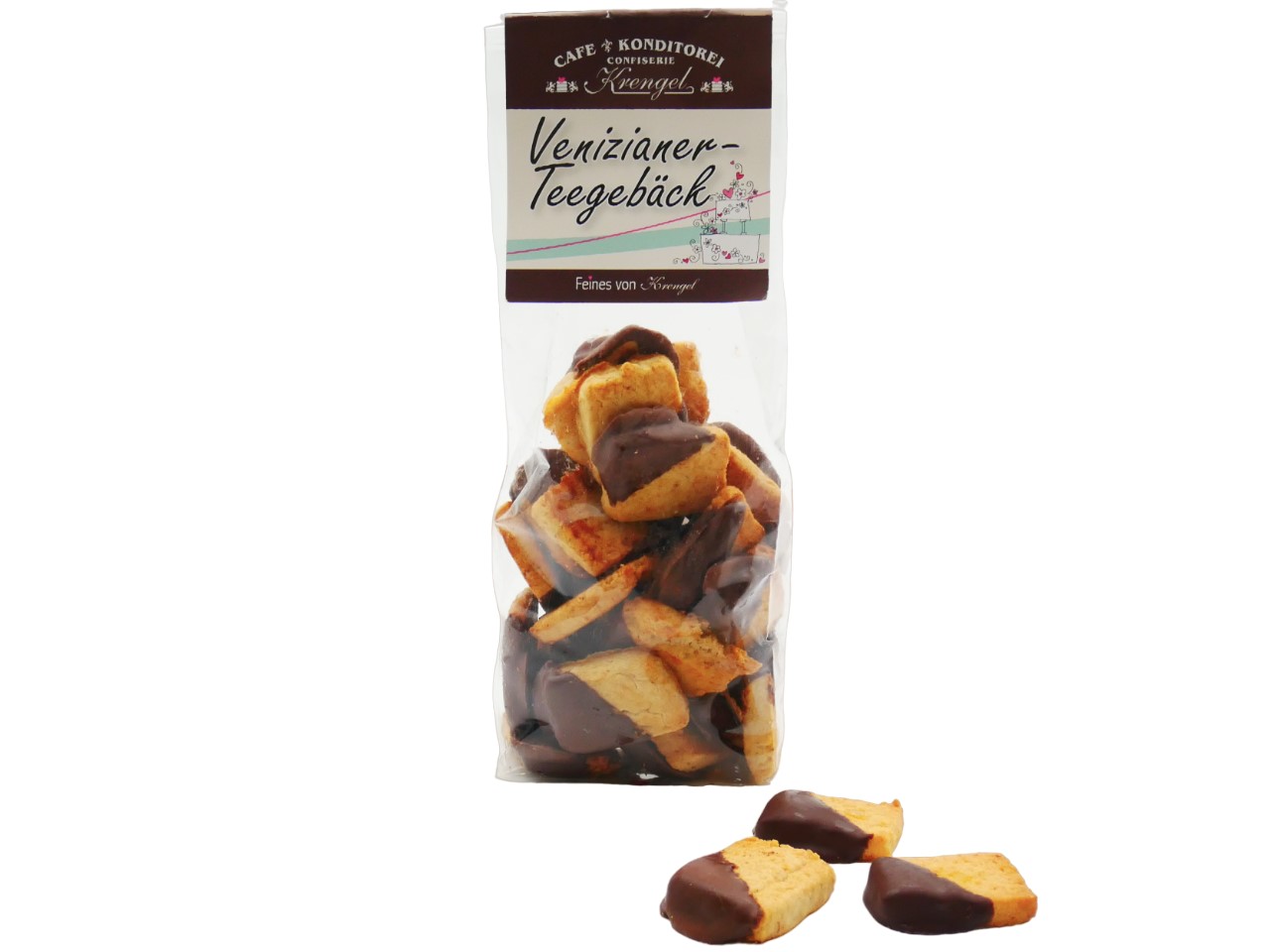 Zutaten: Weizenmehl, Butter, Zucker, Mandeln, Orangeat, Eier, Zitrone, Nelke, Kakaobutter, Kakaomasse, Emulgator, Natürlicher Vanilleextrakt, mind. 65% Kakao